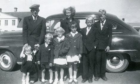 Hjónin frá Brekku í Garði, Steinunn Sigurðardóttir og Vilhjálmur Halldórsson með barnahópinn sinn. Myndin er tekin 17. júní árið 1951 þegar fjölskyldan fór í ferð til Vífilstaða í Garðabæ. Börnin frá vinstri: Vilhjálmur, Halldór, Steinunn, Kristjana, Sigurður og Kristján Vilhjálmsbörn.