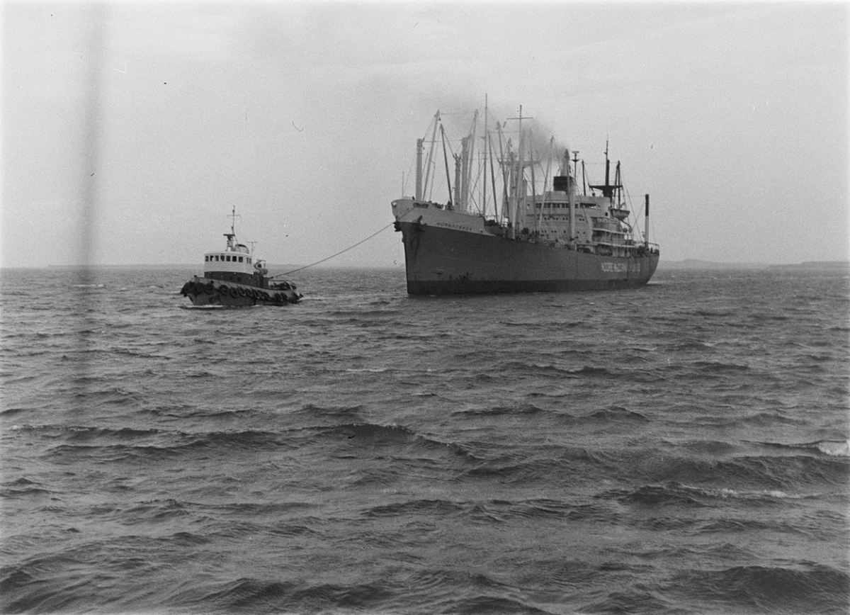Dráttarbátur með stórt flutningaskip í togi. Á stefni þess má sjá nafn skipsins, eitthvað í þessa áttina: MCRMACSACA.