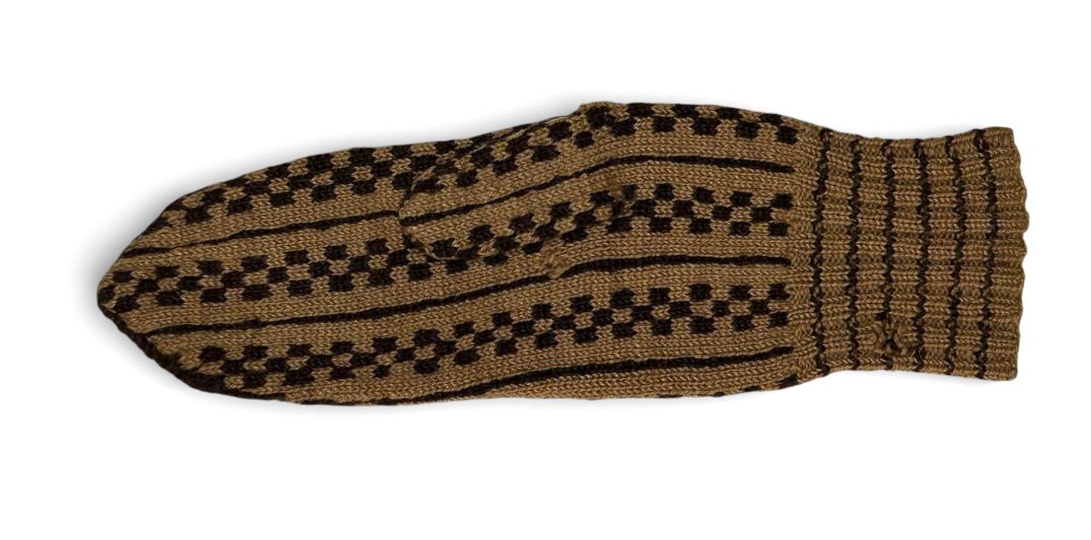 Tvíbanda vettlingur. Litir: Millibrúnn og dökkbrúnn. Vettlingurinn er greinilega notaður, því hann er slitinn og búið að gera við hann að hluta. Það er ekki vitað hver prjónaði hann.