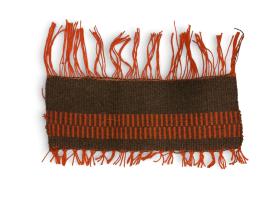 Grá með löngu kögri. Einskeftuvefnaður með einföldu munstri.