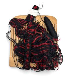 Dökk með rauðum röndum. Einskefta. Rendur ofnar úr hrokknu garni.
