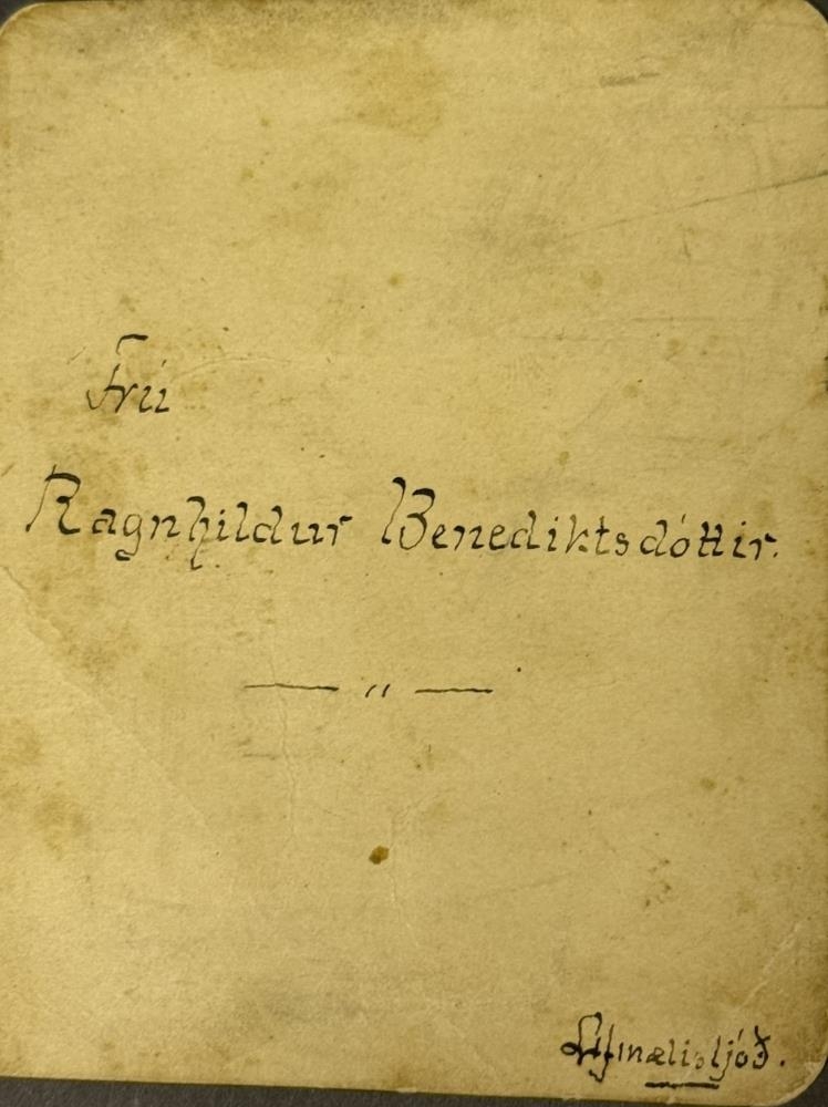 Ljóð eftir Þorstein Erlingsson ritað á lítið pappaspjald. Á annari hlið stendur: Frú Ragnhildur Benediktsdóttir. Afmælisljóð, á hinni hliðinni er ljóðið, í 2 erindum, dagsetningin 1.júní 1913 og undirritun skáldsins. Ragnhildur var frá Tumastöðum í Fljótshlíð og voru þau Þorsteinn systkinabörn. Hún fékk ljóðið í afmælisgjöf frá Þorsteini á 26 ára afmæli sínu. Gefið af sonardóttur hennar, Guðbjörgu Einarsdóttur, Miðseli, Rangárþingi Ytra. Ekki er vitað hvort ljóðið hefur verið gefið út.