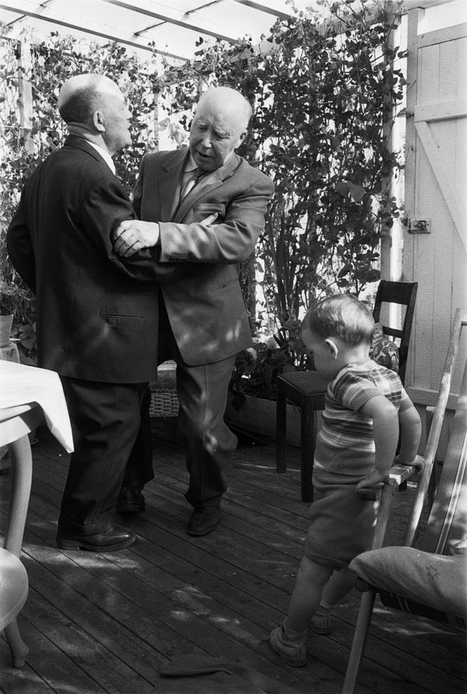 Emil Tómasson og Helgi Hjörvar sýna hvor öðrum glímubrögð, afastrákur Emils, Emil Tómasson fylgist með.