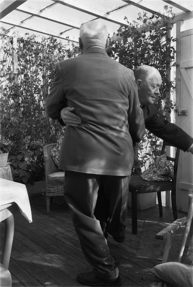 Emil Tómasson sýnir Helga Hjörvar glímubrögð, afkomandi Emils fylgist grannt með.