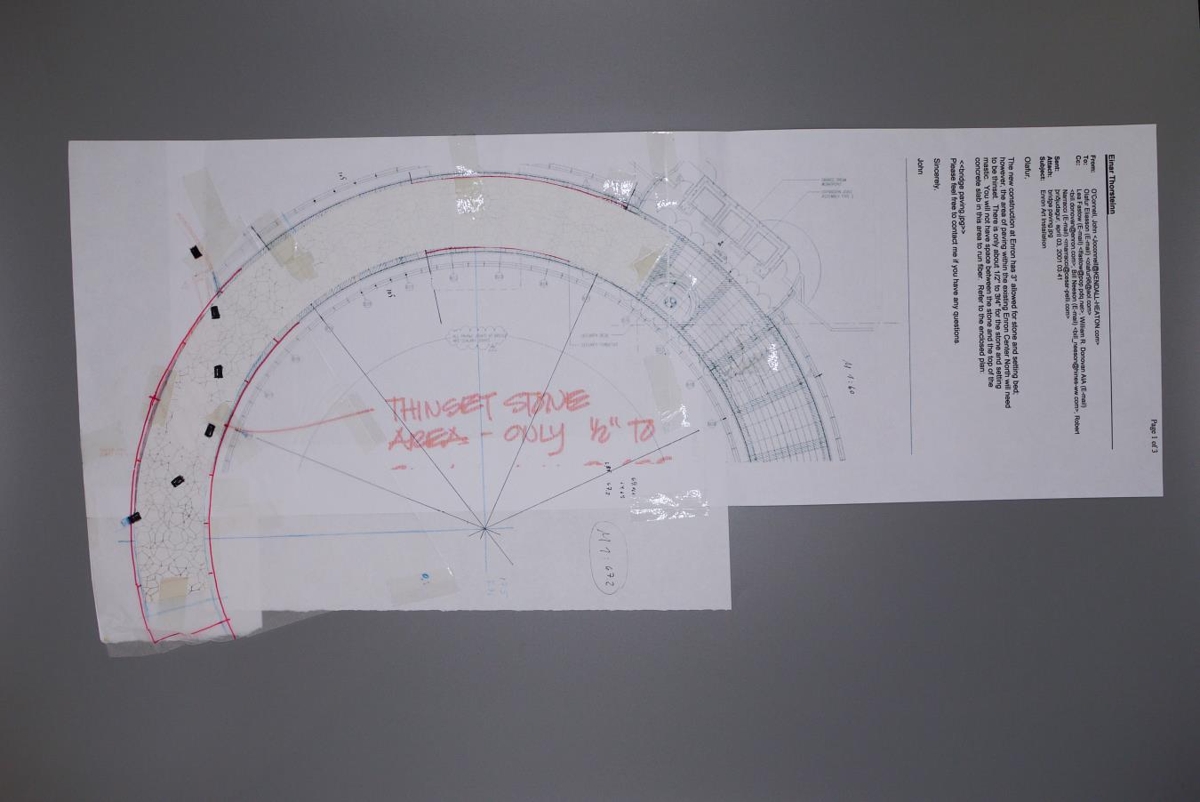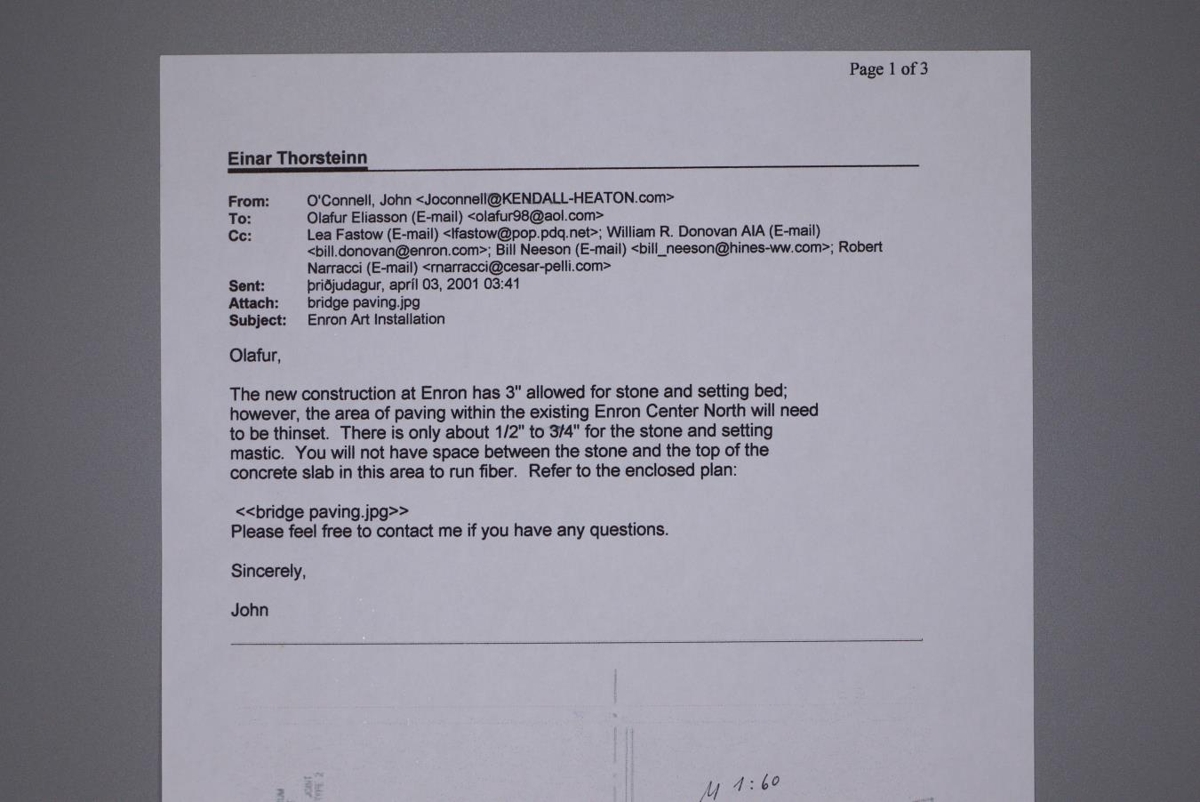 Teikningar, ljósrit og einn tölvupóstur sem tengjast hönnun Himinbrúarinnar. Himinbrúin eða á ensku The Skybridge Project er hönnunarverkefni Einars í samstarfi við Olaf Eliasson sem átti að verða að göngubrú fyrir höfuðstöðvar Enron í Houston Texas, samkvæmt tölvupósti sem límdur er við eina teikninguna og er dagsett 3. apríl 2001. Göngurbrú við höfuðstöð Enron var byggð en á endanum ekki hönnuð af þeim EÞÁ og ÓE. Þessi hönnunartillaga byggir á flísalagningu eftir reglum fimmfaldrar samhverfu (e. fivefold symmetry, tengist Penrose flísum og Amman línum) sem Einar skoðaði mikið m.a. fyrir önnur samstarfsverkefni þeirra ÓE (sjá EÞÁ-2014-11-1). Skrifað er um verkefnið og önnur skyld verk í bókinni "To the inhabitants of space in general and spatial inhabitants in particular", sérstaklega á bls 92, en lesa má almennt um fimmfalda samhverfu á bls. 26-37. Sumar teikningarnar eru límdar saman í bunka, með límbandi, til að sýna lagskitpingu mynstursins. Aðrar eru með tákn sem sýna hvernig hægt er að raða þær saman í lengju til að sjá stærri mynd af hönnuninni.