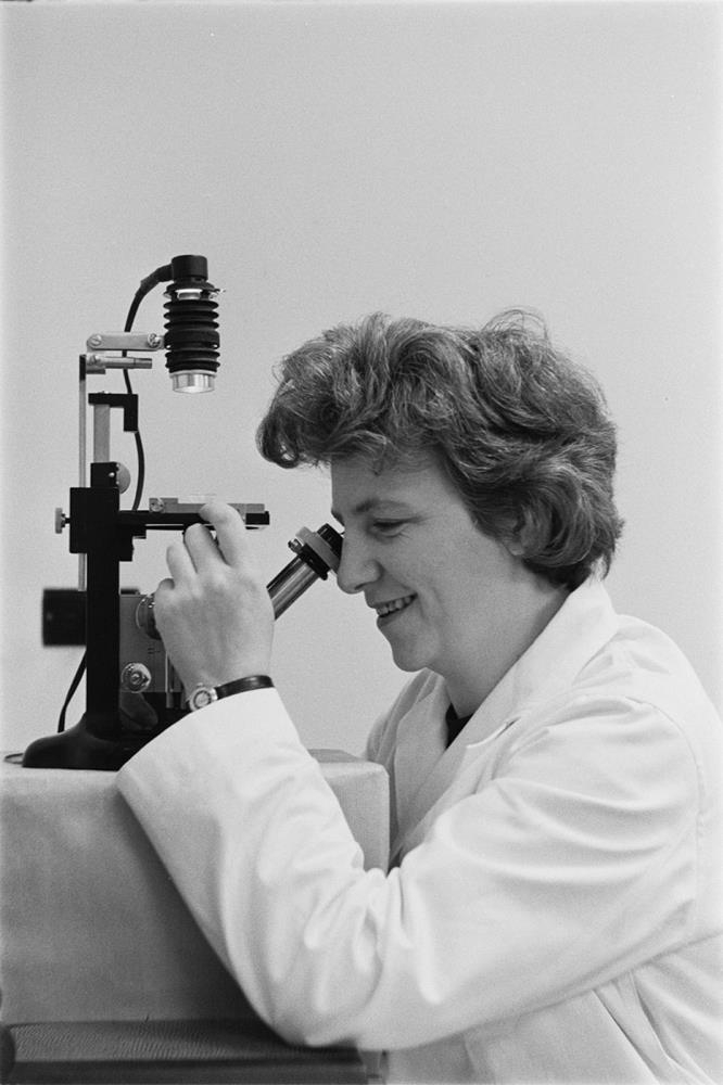 Þórunn Þórðardóttir rannsakar svifplöntur í smásjá.