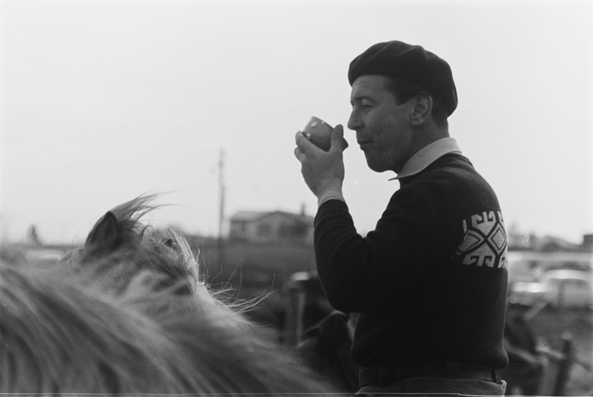 Karlmaður á hestbaki drekkur úr bolla.