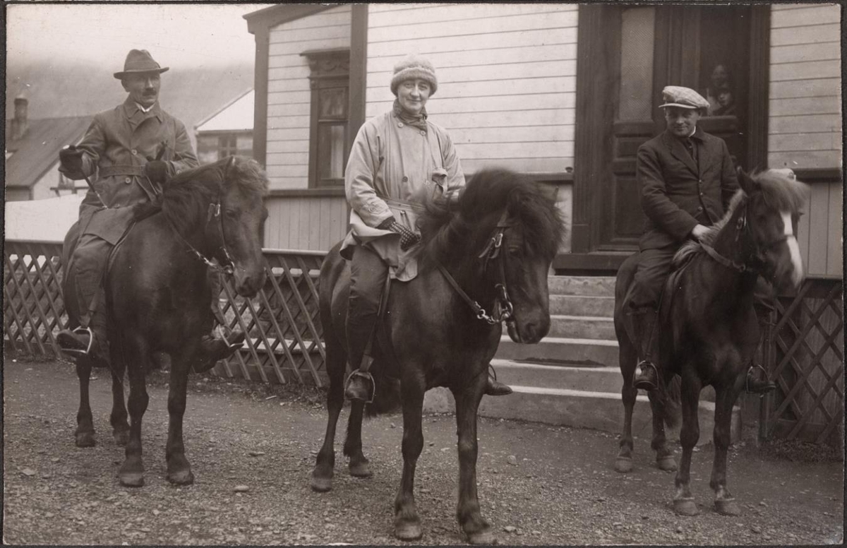 Magnús Magnússon kaupmaður á Ísafirði t.v. ásamt tveim öðrum á hestum.