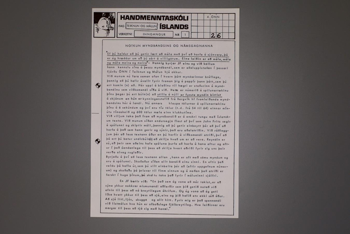 Handmenntaskóli Íslands var bréfaskóli sem starfræktur var 1981-1995. Skólastjórinn var Friðrik G. Friðriksson og við skólann kenndu margir kennarar en til að byrja með helst þeir Haukur Halldórsson og Einar Þorsteinn Ásgeirsson. Nemendur gátu skráð sig í fjölbreytt námskeið og fengu send verkefni í pósti. Þá sendu nemendur unnin verkefni til kennara skólans sem svo gerðu athugasemdir og sendu til baka til nemenda. Til að byrja var boðið upp á fjögur námskeið (teiknun 1. og 2. önn, skrautskrift og bótasaumur) en framboðið jókst með árunum.Safnið geymir bæði frumrit og afrit af umbrotshönnun námsefnisins. Í frumritum eru oft handteiknaðar myndir notaðar sem sýnidæmi eða skýringarmyndir.