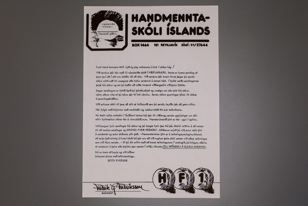 Handmenntaskóli Íslands var bréfaskóli sem starfræktur var 1981-1995. Skólastjórinn var Friðrik G. Friðriksson og við skólann kenndu margir kennarar en til að byrja með helst þeir Haukur Halldórsson og Einar Þorsteinn Ásgeirsson. Nemendur gátu skráð sig í fjölbreytt námskeið og fengu send verkefni í pósti. Þá sendu nemendur unnin verkefni til kennara skólans sem svo gerðu athugasemdir og sendu til baka til nemenda. Til að byrja var boðið upp á fjögur námskeið (teiknun 1. og 2. önn, skrautskrift og bótasaumur) en framboðið jókst með árunum. Í frumritum eru oft handteiknaðar myndir notaðar sem sýnidæmi eða skýringarmyndir.