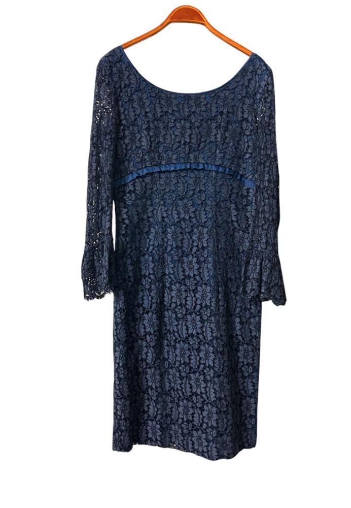 Blár kjóll úr blúnduefni með atlassilki, stuttur, saumaður af saumakonu, Aðalbjörgu Jónsdóttur, á Agnesi Jóhannsdóttur.
