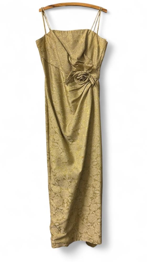 Gylltur, ermalaus samkvæmiskjóll saumaður af saumakonu, Aðalbjörgu Jónsdóttur, á Agnesi Jóhannsdóttur.
