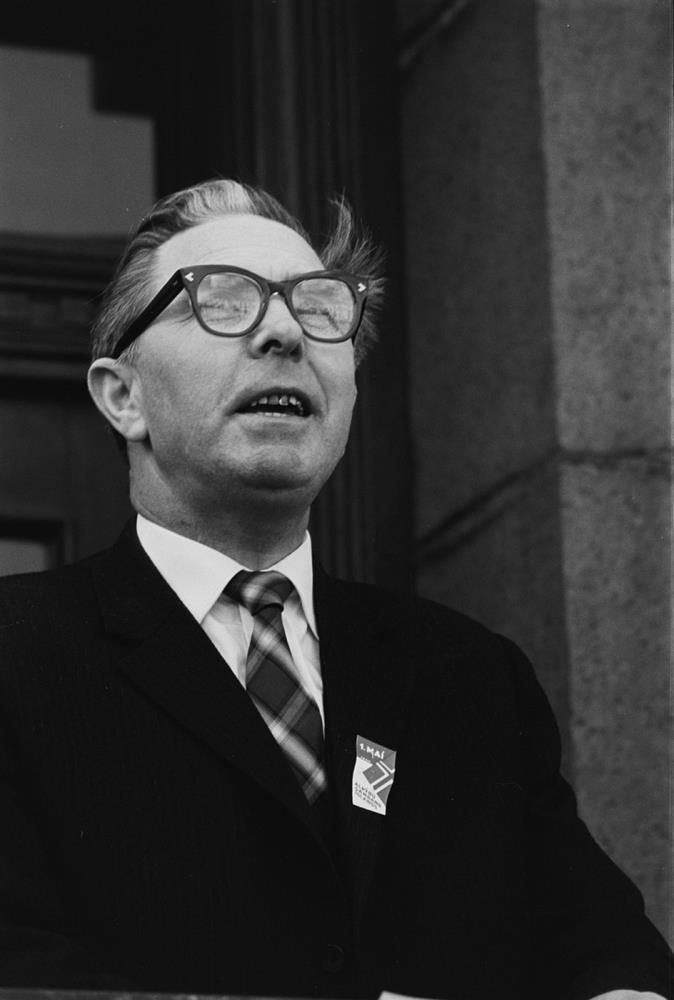 Hannibal Valdimarsson heldur ræðu á útifundi 1. maí 1960.