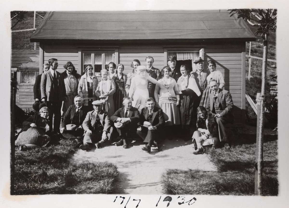 Allstór hópur fólks framan við lítið timburhús, marmarastytta í miðjum hópnum. Á spássíu stendur: 17/7 1930.