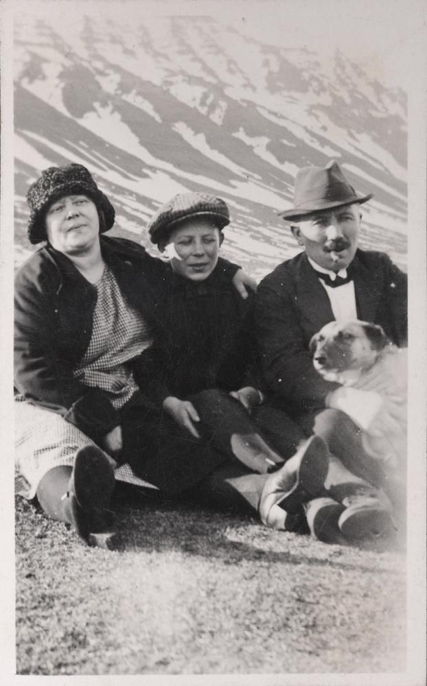 Hjónin Helga Jónsdóttir og Magnús Magnússon kaupmaður og piltur á milli þeirra er líklega sonur þeirra Ásgeir Magnússon seinna vélstjóri. Heimilishundurinn t.h.