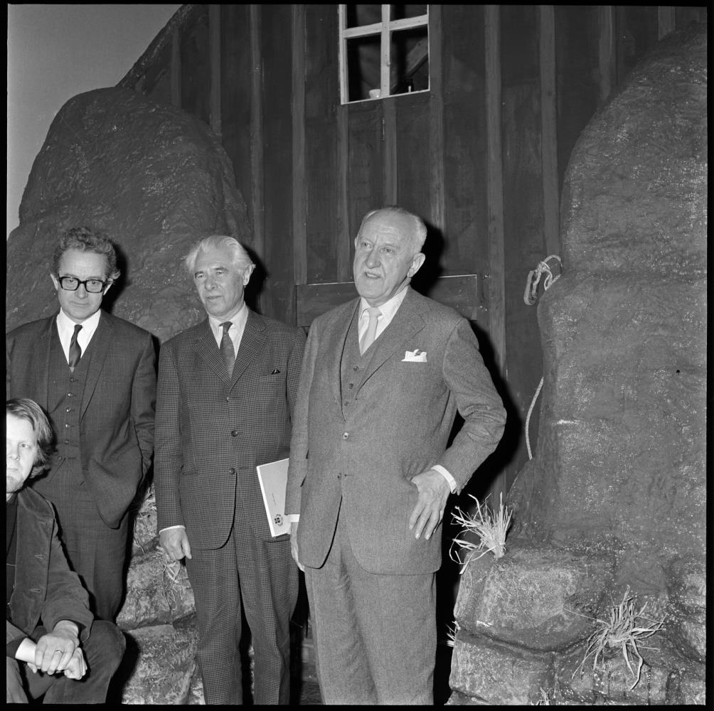 Halldór Laxness, Guðlaugur Rósinkranz leikhússtjóri, Baldvin Halldórsson leikstjóri og Snorri Sveinn Friðriksson leikmyndasmiður, við bæjardyrnar á Sumarhúsum.