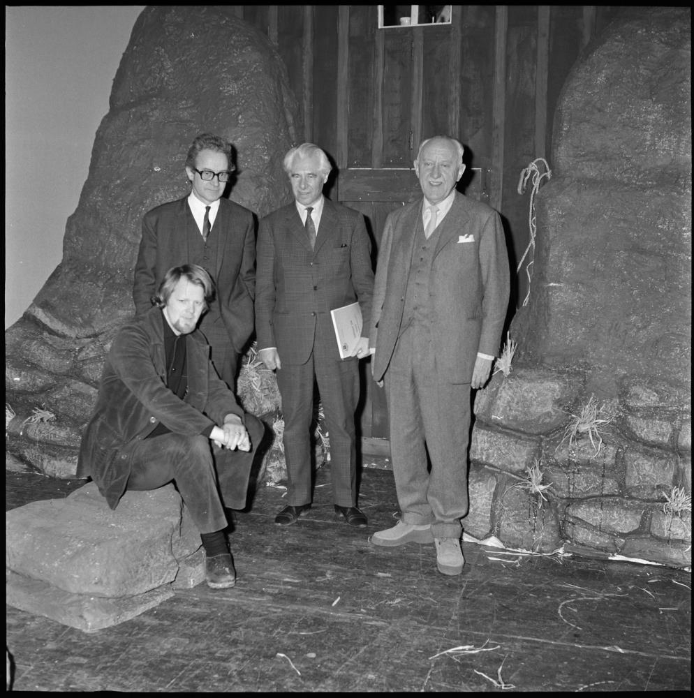 Halldór Laxness, Guðlaugur Rósinkranz leikhússtjóri, Baldvin Halldórsson leikstjóri og Snorri Sveinn Friðriksson leikmyndasmiður, við bæjardyrnar á Sumarhúsum.