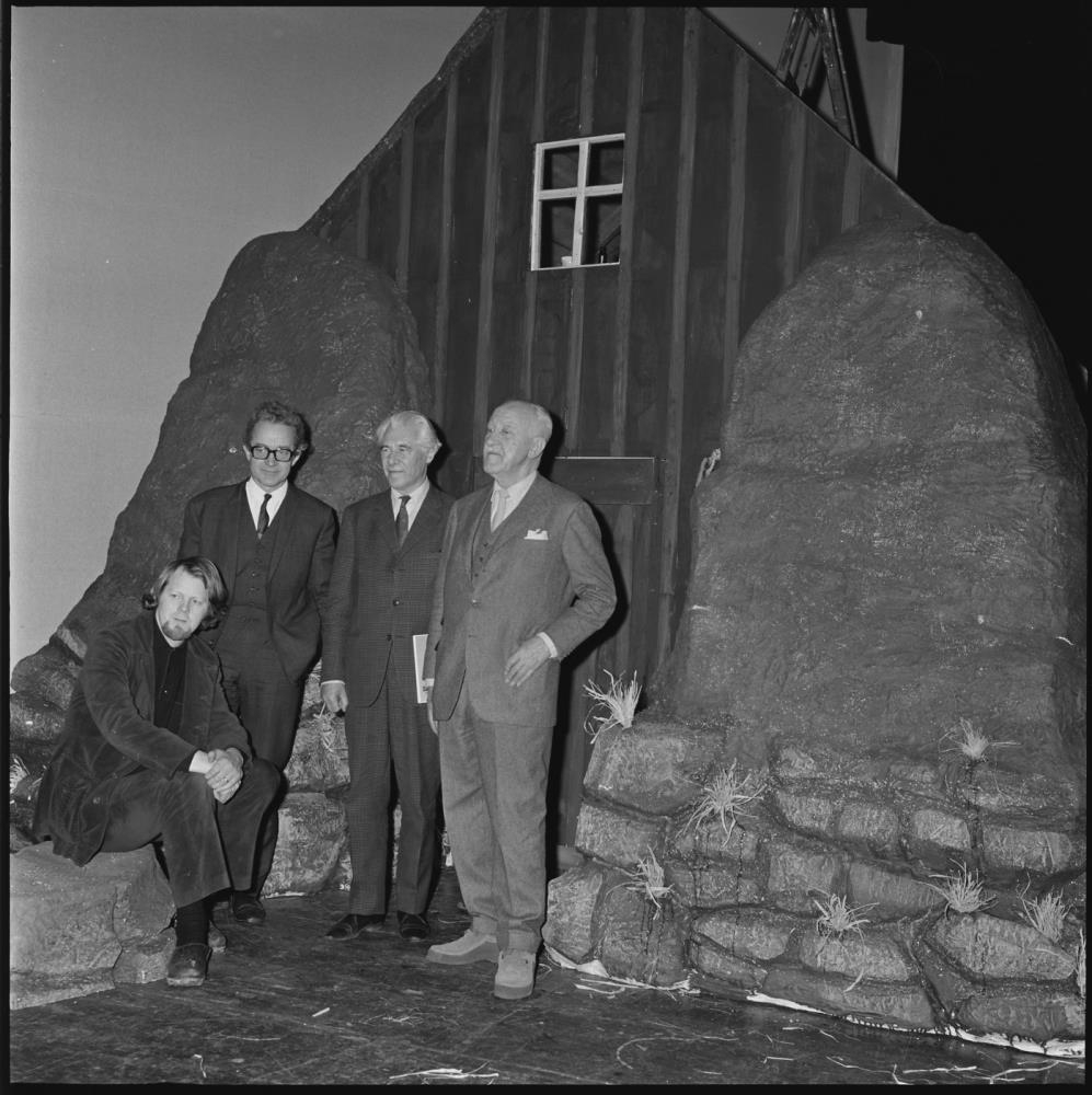 Halldór Laxness, Guðlaugur Rósinkranz leikhússtjóri, Baldvin Halldórsson leikstjóri og Snorri Sveinn Friðriksson leikmyndasmiður, við bæjardyrnar á Sumarhúsum.