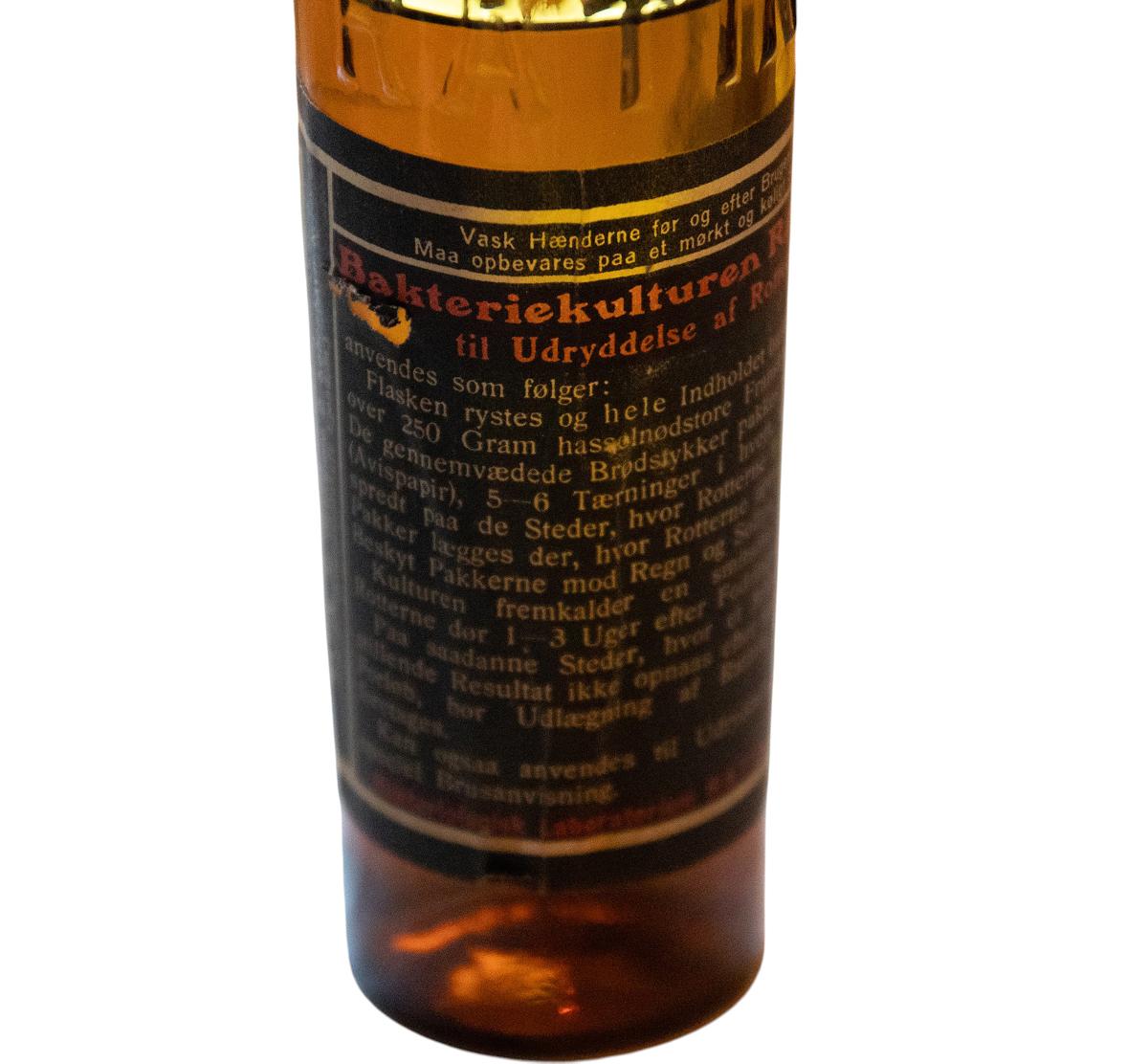 Rottaeitur með leiðbeiningar á miða um meðhöndlun. Eitrið verður að umgangast með varúð. Einnig eru upplýsingar á flösku að eitrið renni út 17.03.1923.
