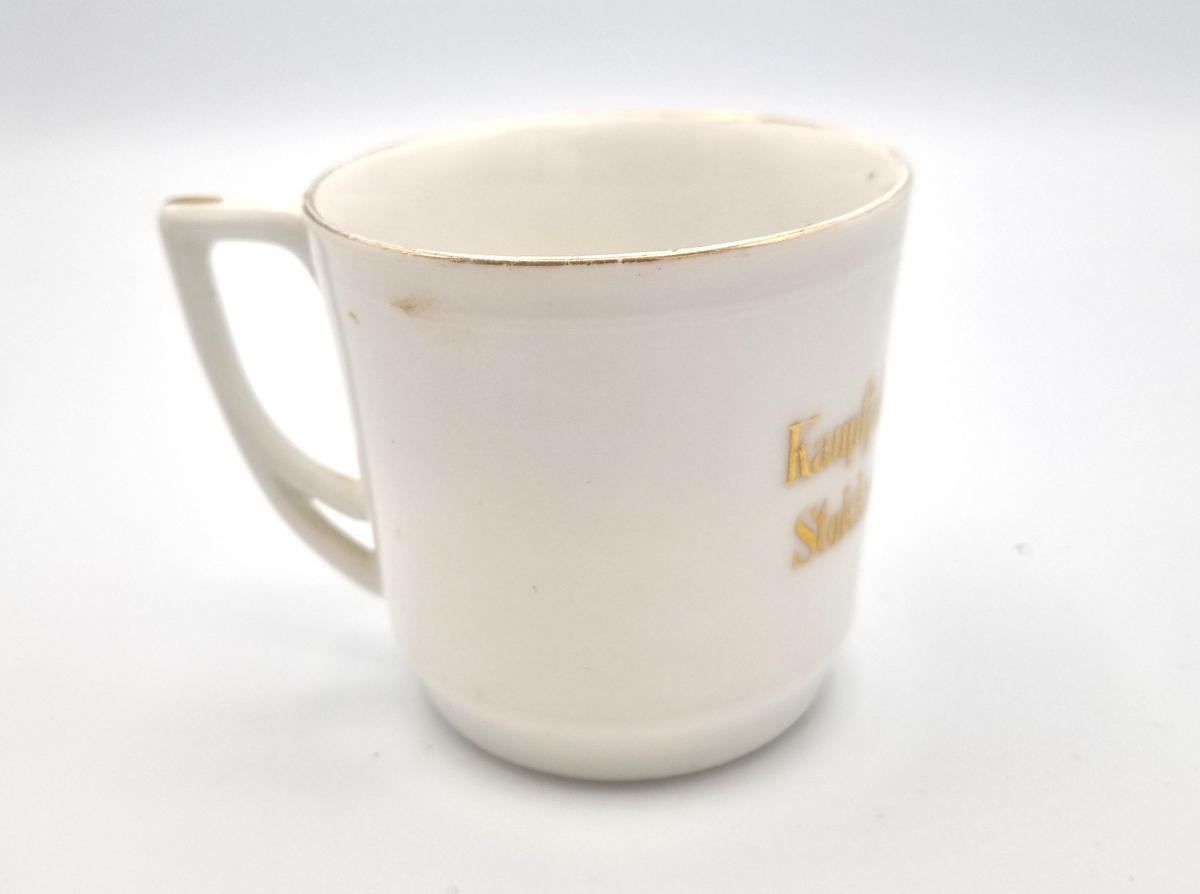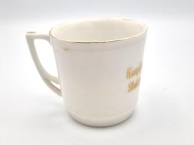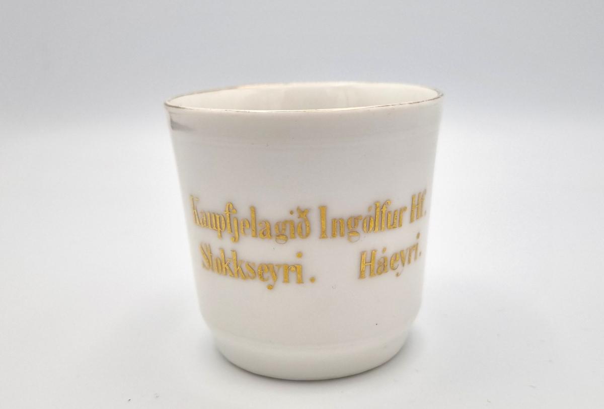 Hvítur bolli með áletruninni "Kaupfjelagið Ingólfur Hf. Stokkseyri. Háeyri."
