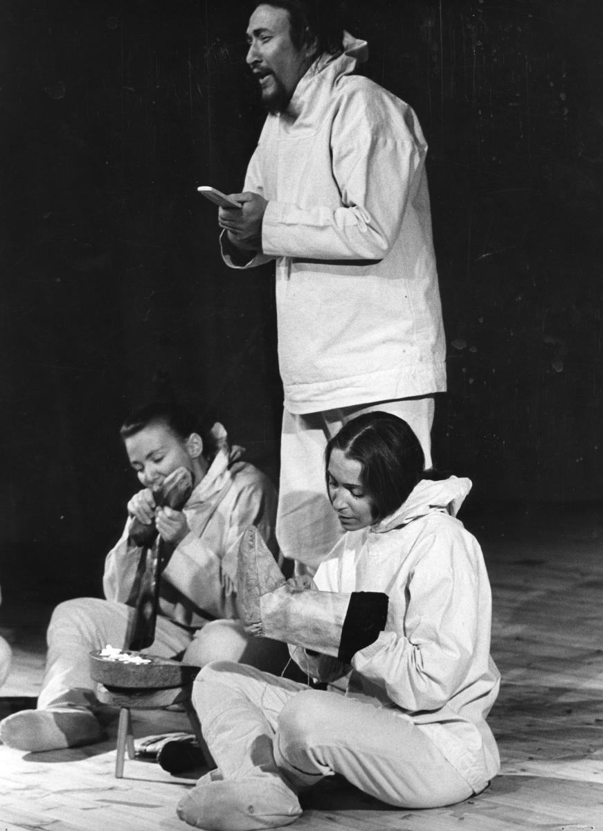 Úr leiksýningu Þjóðleikhússins: INÚK - Maðurinn, árið 1974. Þrír leikarar á sviðinu.