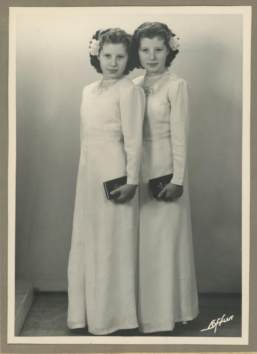 Tvíburasysturnar Jónína Þóra (Nína) og Unnur Dóra (Dóra) Kristmanns, dætur Sigríðar Þorgilsdóttur frá Knarrarhöfn í Hvammssveit og Ingibergs Sigurjóns Kristmanns.