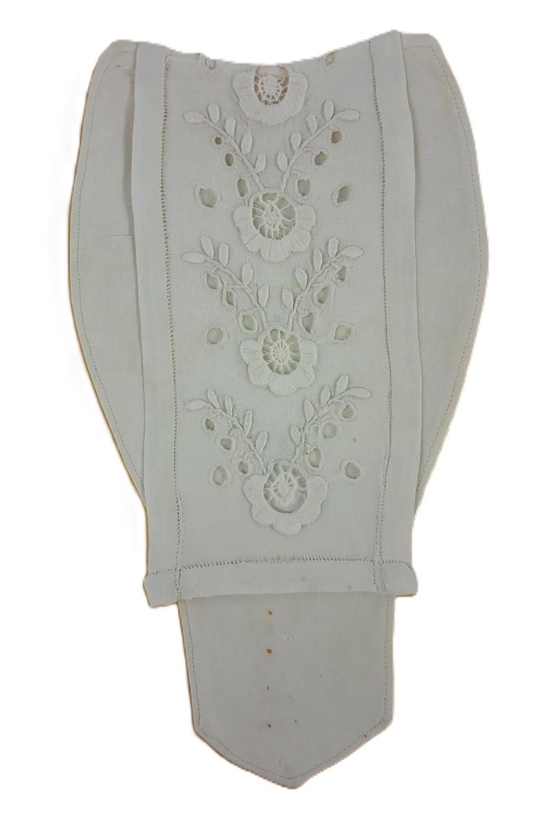 Lítið stykki 10x20 cm. handhúllfaldað, fest framan á brjóstið og eru útsaumuð fjögur blóm það efsta hálft, með hvítu garni. Enskur og franskur saumur, flatsaumur og hedebø innst í hverju blómi. Brjóstið er harðstífað.