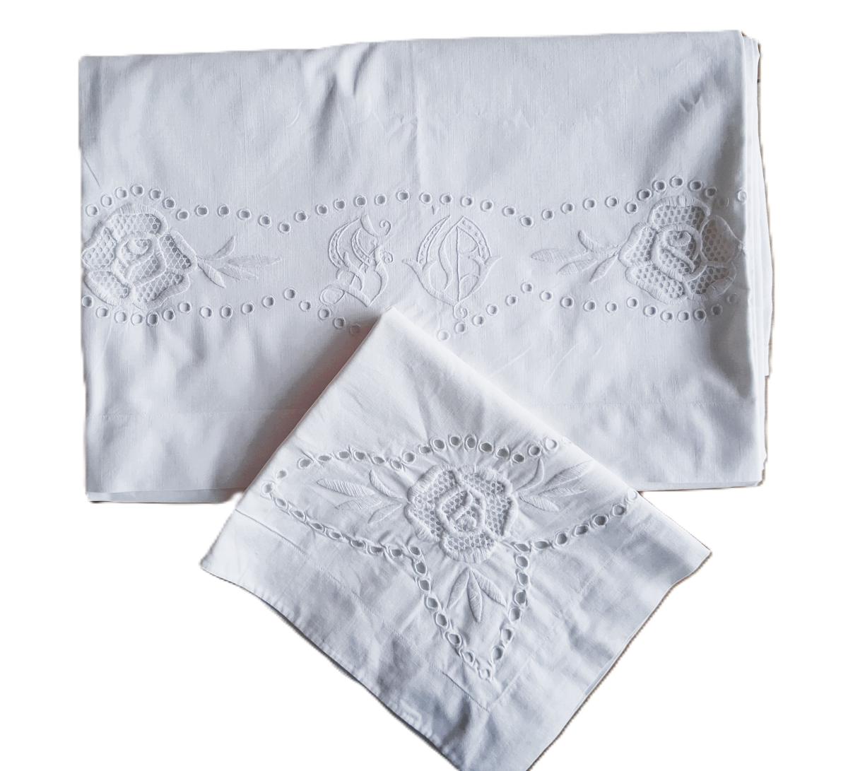 b) Koddaverið er í stíl við sængurverið. Þar er saumað eitt blóm og enskur saumur í kring í annað hornið en í hinu horninu eru stafirnir S.Ó. Stærð koddaversins er 50 x 40 cm.
