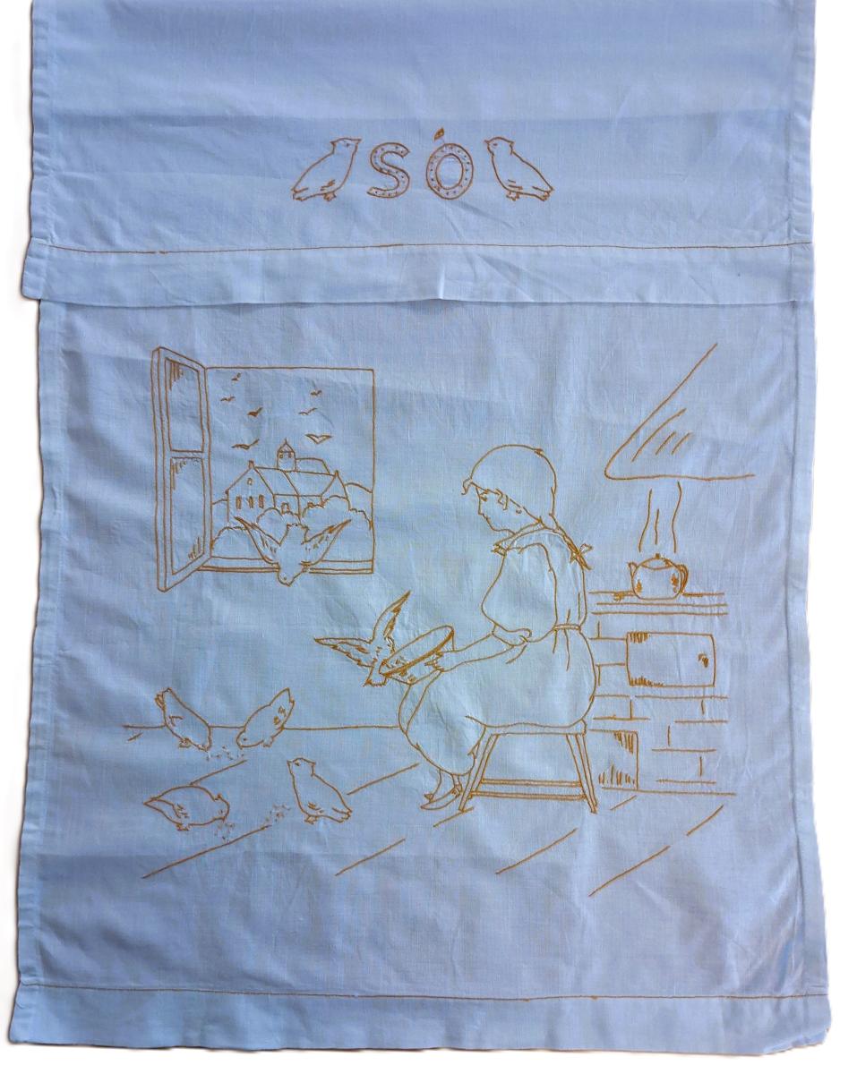 Puntuhandklæðið er með útsaumaðri mynd af konu sem er að gefa fuglum. Kontórstingur (leggsaumur).