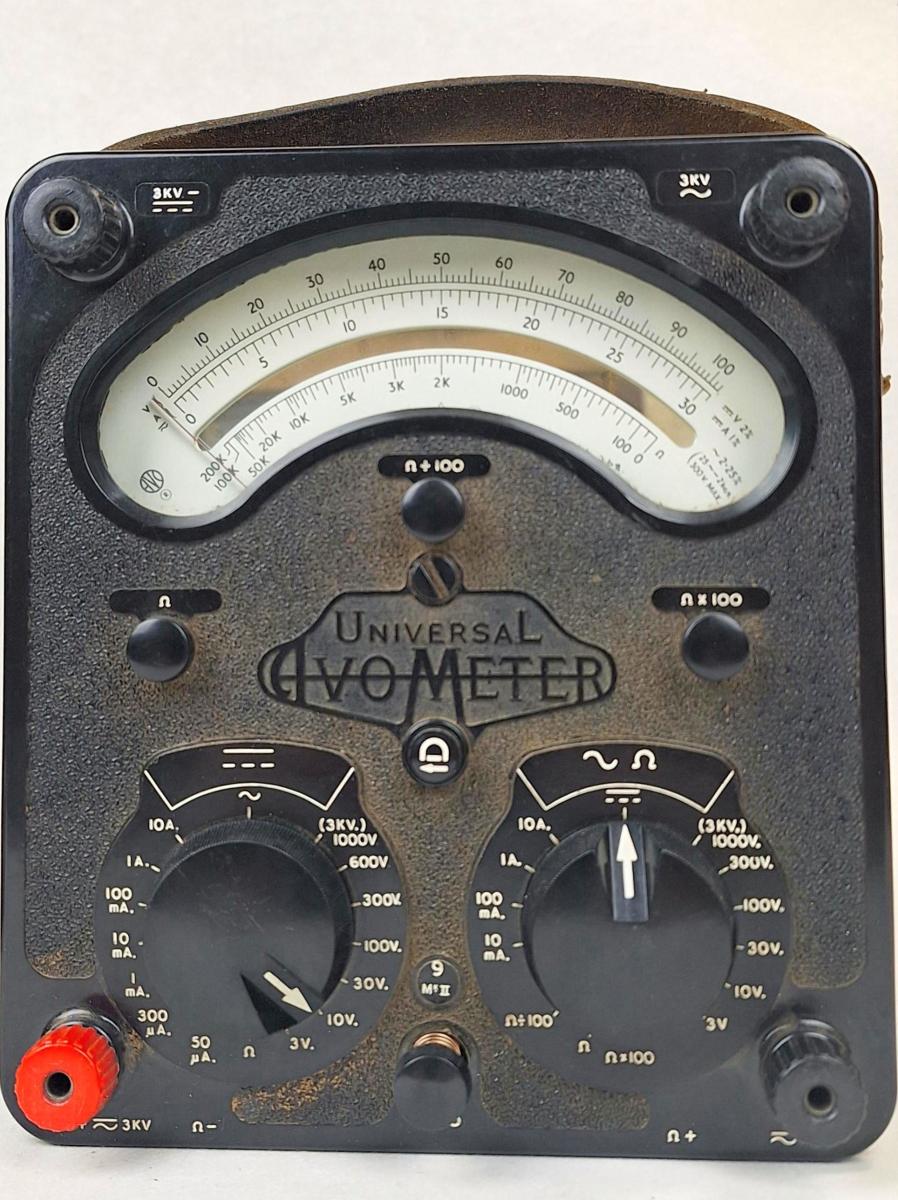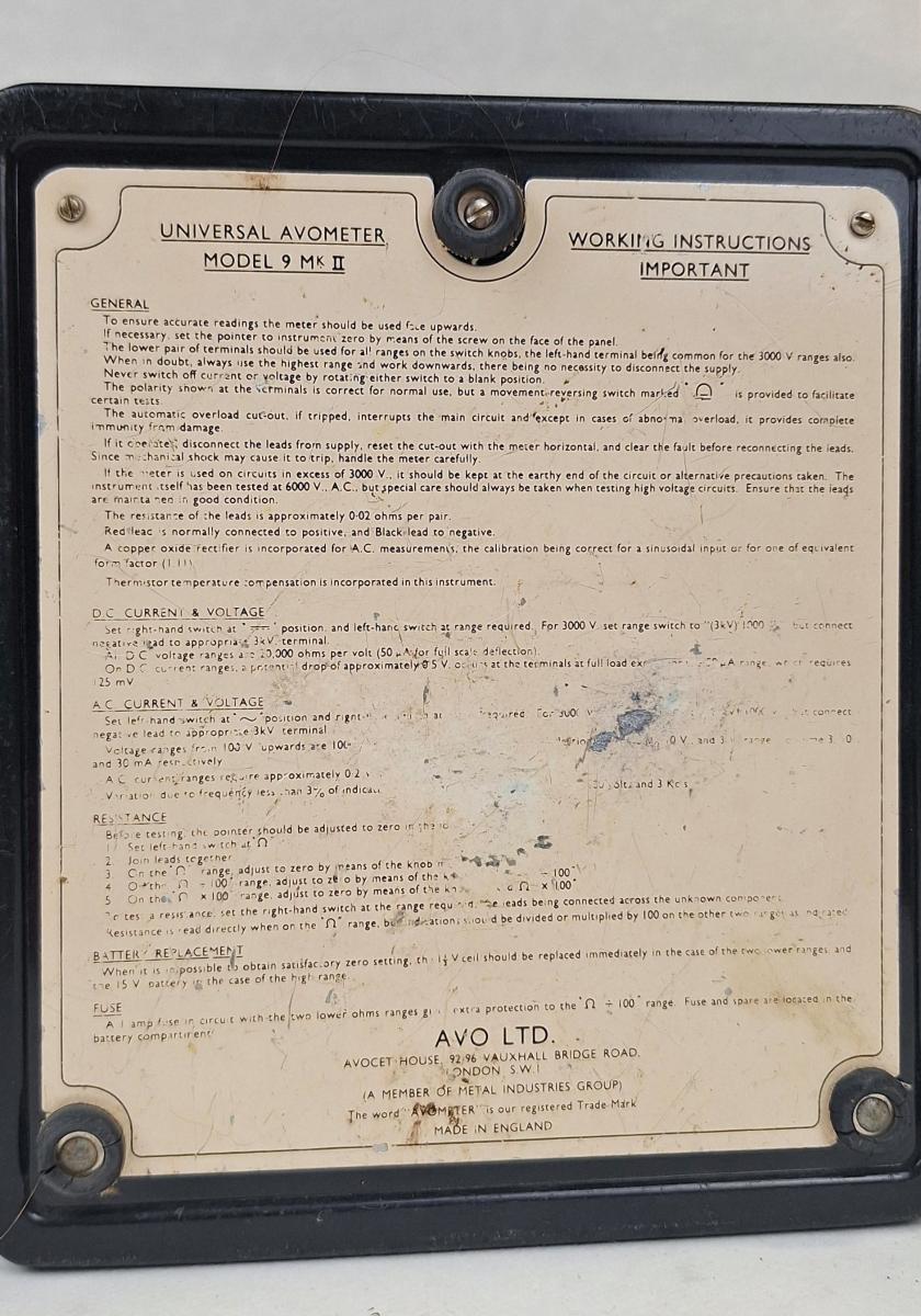 Avomælir í brúnni leðurtösku með handfangi. Á honum stendur "Universal Avometer". Þar fyrir neðan eru tveir snúningstappar. Gluggi með kvörðum. Þetta er fjölskalamælir, hægt að mæli Amper (straum), Volt (spennu) og Ohm (viðnám). Á honum eru fjögur úttök fyrir mismunandi straum. Var á ritsímasýningu Tækniminjasafnsins í gömlu símstöðinni á Seyðisfirði. Tvær snúrur fylgja með, önnur rauð og hin svört. Aftan á mælinum eru leiðbeiningar. Þar má sjá að þetta er MODEL 9 MK 2.
