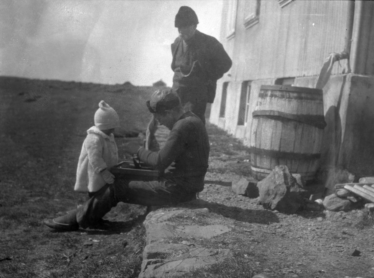 Myndin er tekin við suður hlið Klausturhóla í Flatey, og sést bókasafnið, áður en það var flutt og Hólsbúð fyrir aftan. Á myndinni er Sigurður Jensson, langafi minn, f. 15. Júní 1853, l. 5.1.1924, sonur hans Jón Sigurður Sigurðsson (seinna prófessor í lyfjafræði við Chapel Hill háskóla í Norður-Karolínu, USA) (f. 13.09.1887, d. 2.8.1924)... Mér finnst afar líklegt að Sigríður Zoega hafi tekið myndina. Er með margar myndir frá henni, frá Flatey og annar staðar. Móðir Sigríðar var Bryndís, systir Guðrúnar langömmu, konu Sigurðar. Sennilega er myndin tekin 1921, og þá að það sé Sigurður sem sé barnið. (APS 2026)