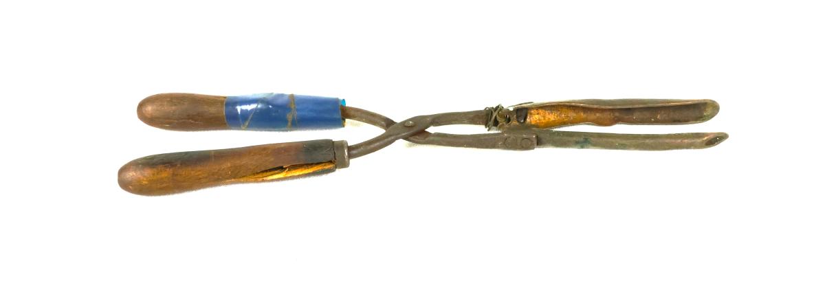 Heimasmíðað krullujárn úr járni. Var í eigu Auðbjargar Benediktsdóttur á Hala (1868-1942). Tréhólkar hafðir sem höldur. Viðgert með límbandi og grönnum vír. Gefið Þórbergssetri 30.06.2006.