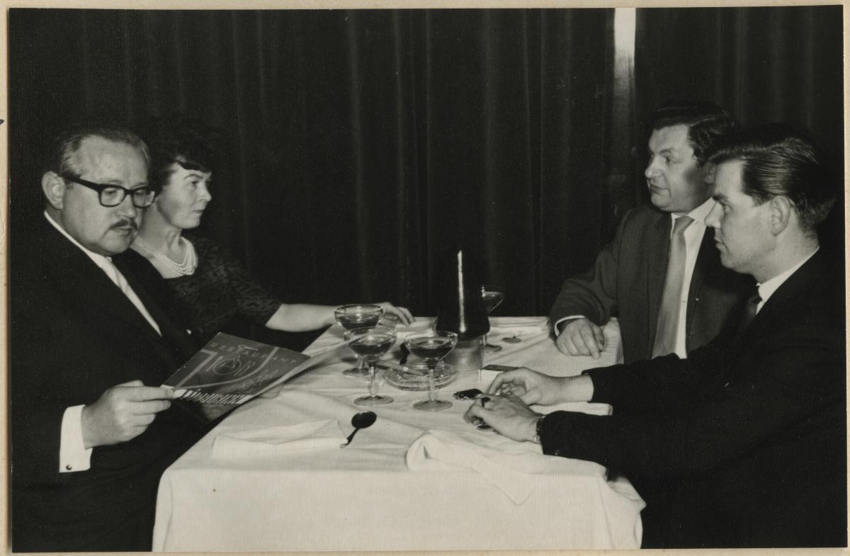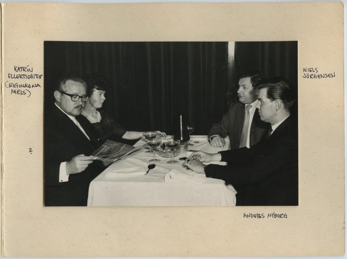 Fjórir matargestir sitja við hvítdúkað borð. T.v. er óþekktur og Katrín Ellertsdóttir (eiginkona Niels), og t.h. Niels Jørgensen fjær og Andesr Nyborg nær.