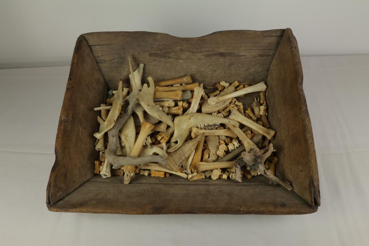 Hefðbundið trog, nú nýtt sem geymslustaður fyrir bein (gömul barnsleikföng). Er komið að láni frá Byggðasafni Austur-Skaftafellssýslu en Númerið BA 425 er á miða neðan á troginu.