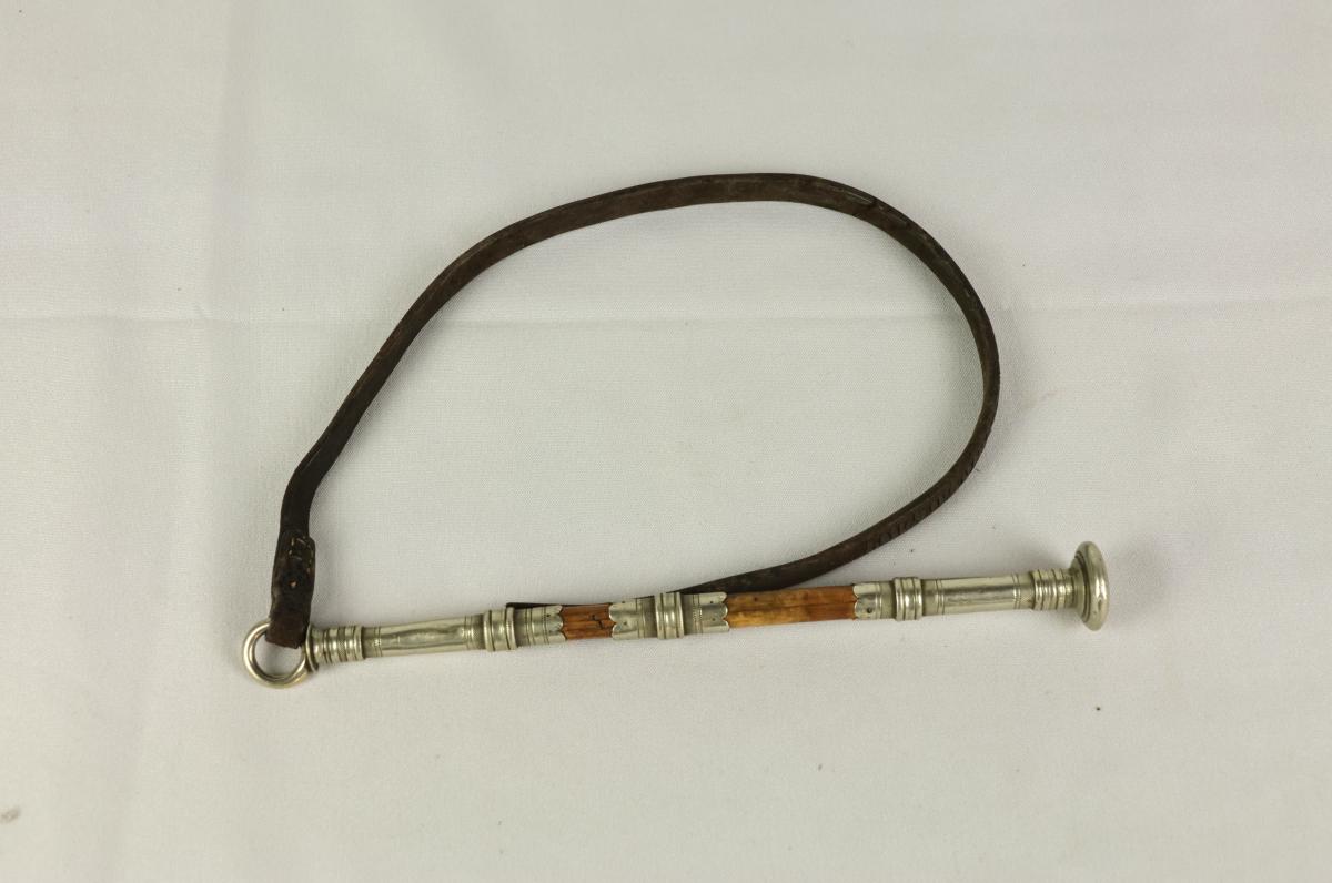 Kvensvipa úr tré með silfurhólkum á endum og leðuról. Á endahnúð handfangs eru upphafsstafir eigandans, Steinunnar Guðmundsdóttur húsfreyju á Hala: S.G.