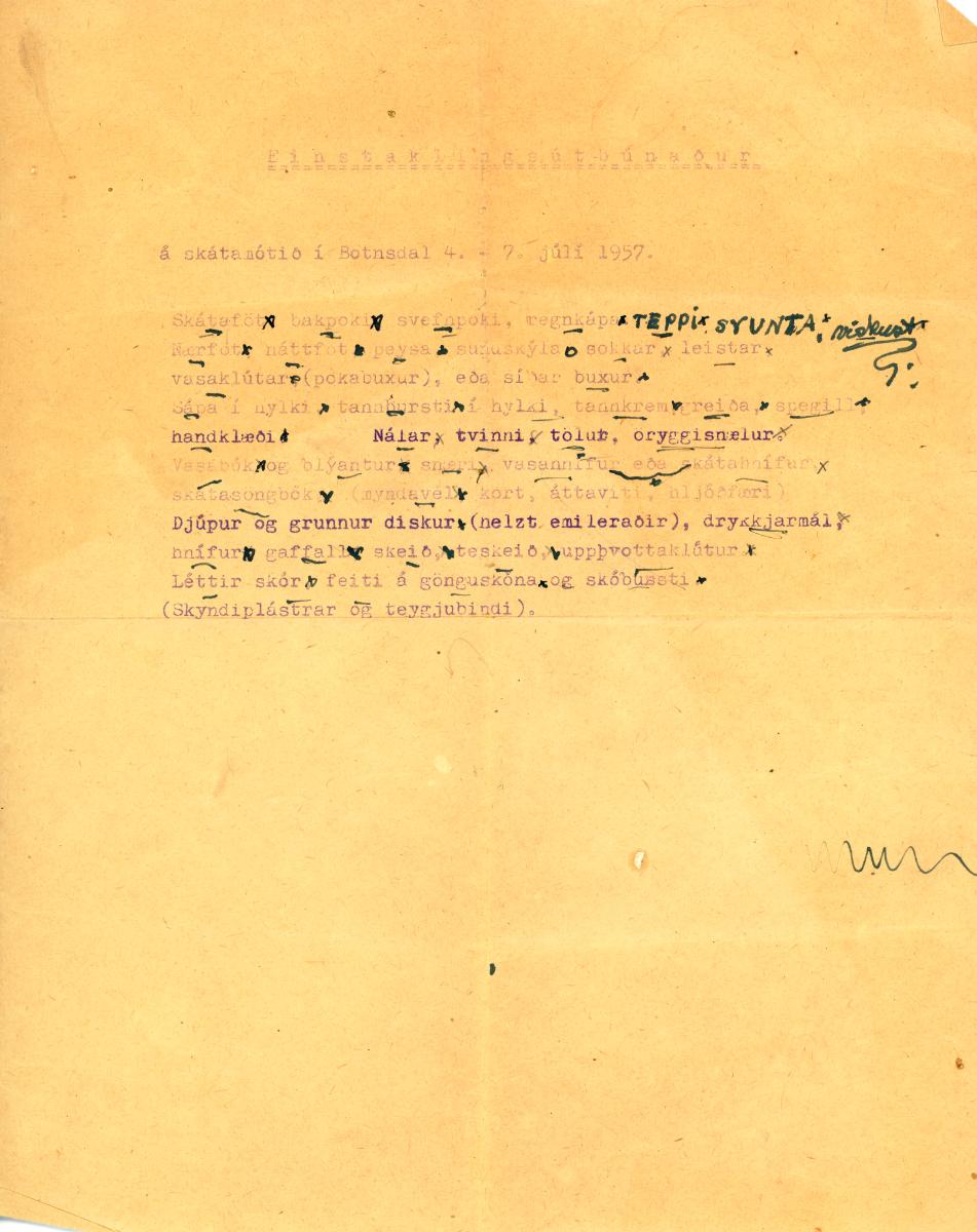 Einstaklingsbúnaður á skátamótið í Botnsdal 4.-7. júlí 1957