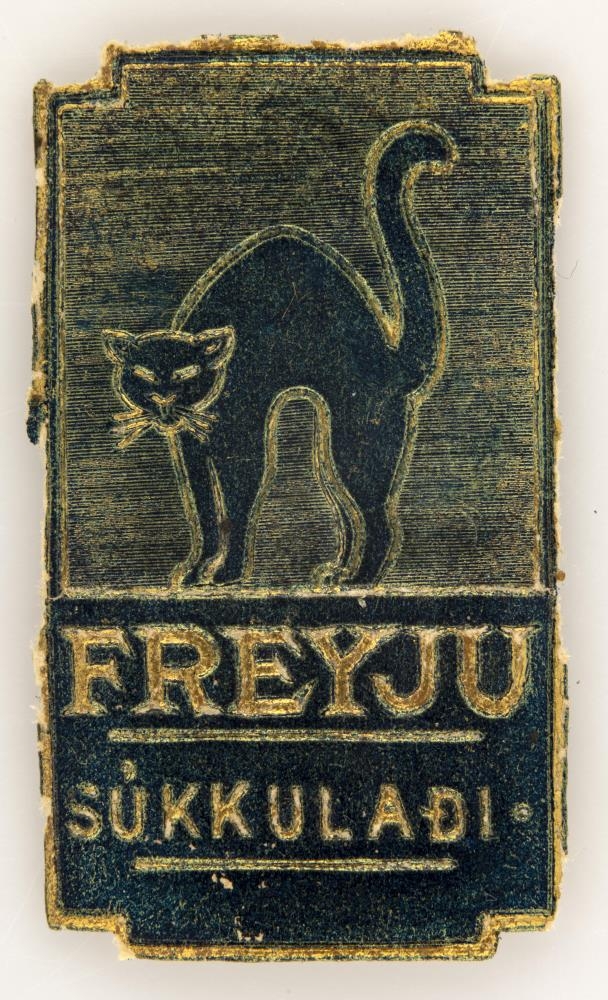 Merkimiði, ferhyrndur og ílangur í laginu, uppréttur, 3,8 sm á l., 2,2 sm á br. Með lágt upphleyptu verki á framhlið, og þar grænn litur, dökkgrænn og gylltur, sjá má mynd af ketti og er letrað neðan myndar: „Freyju/súkkulaði“, upph. st. Lím á bakinu.