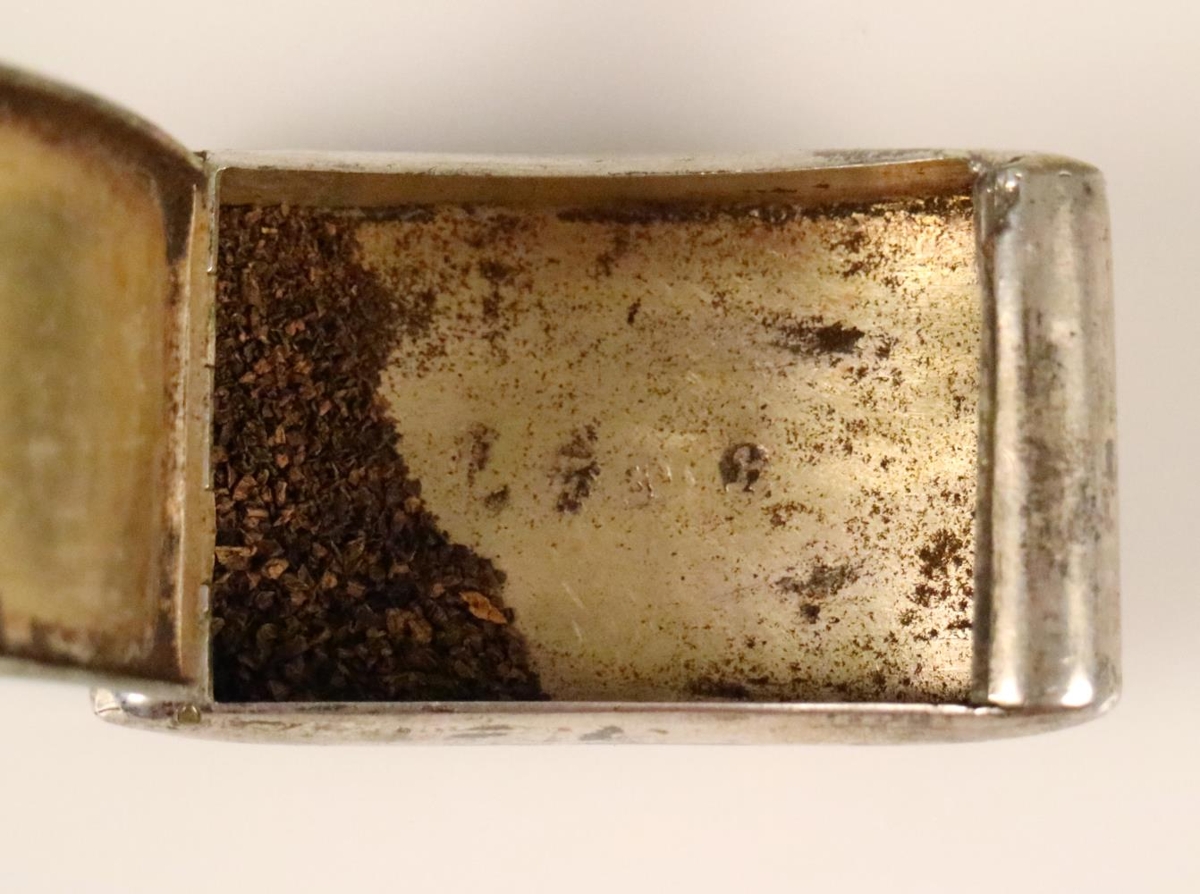 Á botninum að innan eru 4 stimplar: Merki Kaupmannahafnar; varðarmerki Freder. Fabritiusar; smiðsmerkið, óljóst (CLC?, Christian Lindahl Christensen); og mánaðarmerki, steingeitarmerkið (21.des. -21.jan.). Dósirnar eru gylltar innan. Í þeim eru tóbaksleifar.