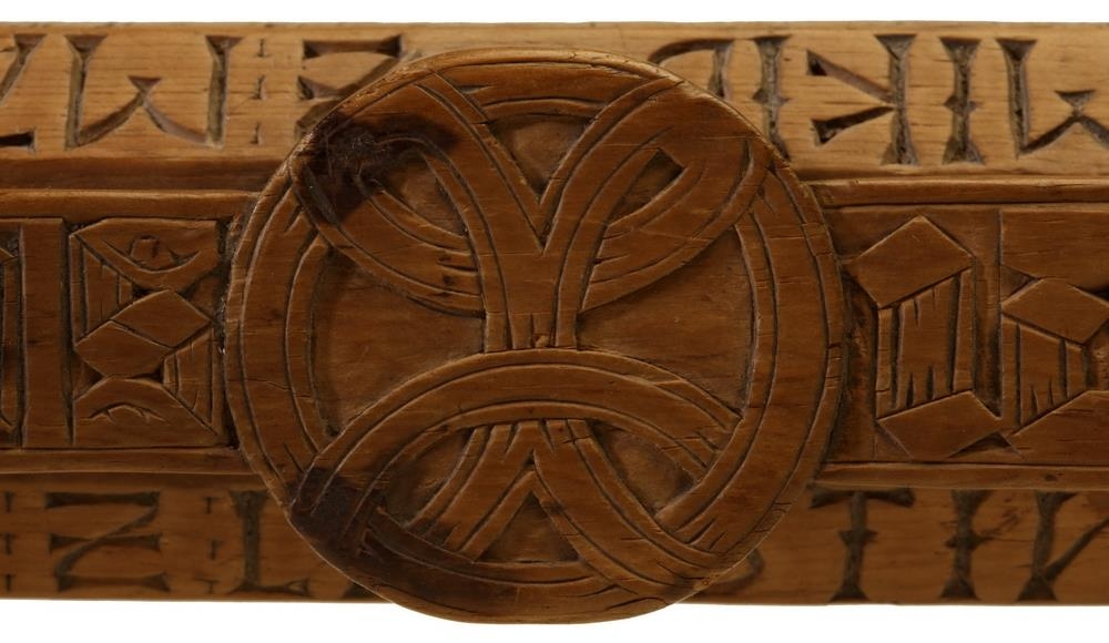 en þó skal rita það, sem skrifað stendur. Ofan á keflinu er skorið með