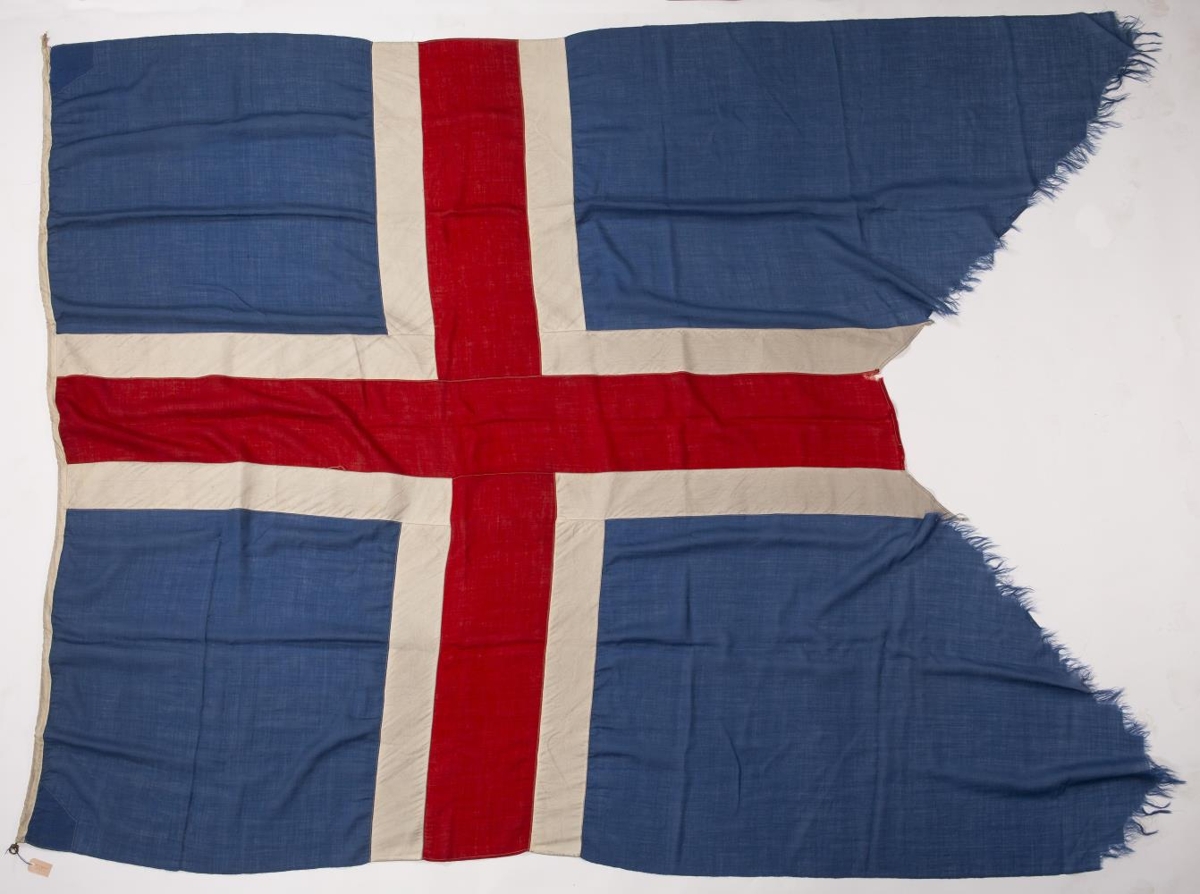 Stjórnarfáni Íslands, klofinn ríkisfáni, sá er notaður var af stjórnarráðinu á húsi þess frá 1. des. 1918, er sambandslögin gengu í gildi, og um nokkura mánuði. Reitirnir og rauði krossinn eru úr ullardúk, fánadúk, en hvítu ræmurnar úr ljerepti og er slíkt óviðeigandi. Blái liturinn er grænleitari en sá er fánanefndin 1914 lagði til að vera ætti í þjóðfána Íslands, og stjórnarfána, eptir að hann var sjerstaklega ákveðinn samkvæmt tillögum hennar, eða sömu manna, gerðum 26. jan. 1919; sömuleiðis er rauði liturinn dekkri en sá er sama nefnd vildi vera láta í þessum fána. - Er als ekki, í þessu tilliti, farandi eptir þeim litum, sem eru á fánamyndinni flgskj. XII. í skýrslu nefndarinnar, Íslenzki fáninn, Rvík., 1914. - Þessi fáni er rjett gerður og samkvæmt konungsúrskurðinum um hinn óklofna þjóðfána frá 19. júní 1915, er breiddina snertir á fánanum, krossinum og röndunum; breiddin er 243 cm., rauði krossinn 27 og randirnar 13,5, breidd krossins alls í hlutfalli við alla breiddina svo sem 2:9; en útreitirnir eru nú mjög slitnir yzt, hornin af, svo að ekki er fullvíst um lengd þeirra upphaflega; nú eru þeir um 170 að l., en sýnilega hefur þessi fáni verið miklu styttra klofinn og útreitirnir styttri en vera skal á rjettum stjórnarfána samkvæmt konungsúrskurðinum um gerð hans, sem var samróma fyrgreindum tillögum fánanefndarmanna frá 26. jan. 1919. Ytri hlutinn af langálmu krossins er heill og er 96 cm. að l. frá innra jaðri hvítu randanna ytri í þverálmunni, en ætti samkv. tillögunum og úrskurðinum að vera 135 [Fyrir ofan 135 stendur 121,5. GS], þ.e. hafa sömu lengd og allur hinn innri helmingur hans. Hefur fáni þessi sennilega verið gerður nokkuð af handa hófi, að því er snertir lengd útreitanna og klaufarinnar, en hvorki voru fengnar tillögur fánanefndarinnar nje kominn úrskurður konungs um stjórnarfána Íslands er þessi fáni var fyrst notaður. - Þess skal getið hjer, að ritari fánanefndar, þjóðminjavörður, kaus helzt að stjórnfáninn væri tvíklofinn, krossinn myndaði tungu, svo sem er stjórnarfáni Noregs, og annar nefndarmaður (Ólafur Björnsson ritstjóri) var einnig þeirrar skoðunar að svo væri klofni fáninn fegurstur.