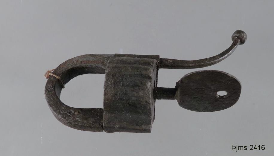 Hengilás úr járni með einkennilegri og fásjetri gerð, líklega sænskur og frá fyrri hluta 19. aldar. Hann er hólkmyndaður og er hólkurinn 3,1 að þverm. og 2,2 að l. Botn í báðum endum og er lyklinum smeygt inn um ferhyrnt gat á neðra botninum, en kengpum niður í útskot sem eru út úr hólkinum á tvo vegu. Niður öðrum kengendanum gengur beygja með hnúð á endanum og dregst hún upp í útskotið er hengnum er lypt upp til að opna lásinn, en hnúðurinn hindrar kenginn í að losna algerlega við lásinn. Kengurinn er ferstrengur í gagnskurð: á hann virðist stimplað nafnið J. HEDLUND og talan 87: sama tala er á lyklinum. Hann er ferstrendur að framan, með fjórum hökum á tvær hliðar: hladið er sporöskjulöguð plata með litlu gati á. Lásinn er vel gerður og óskemdur.