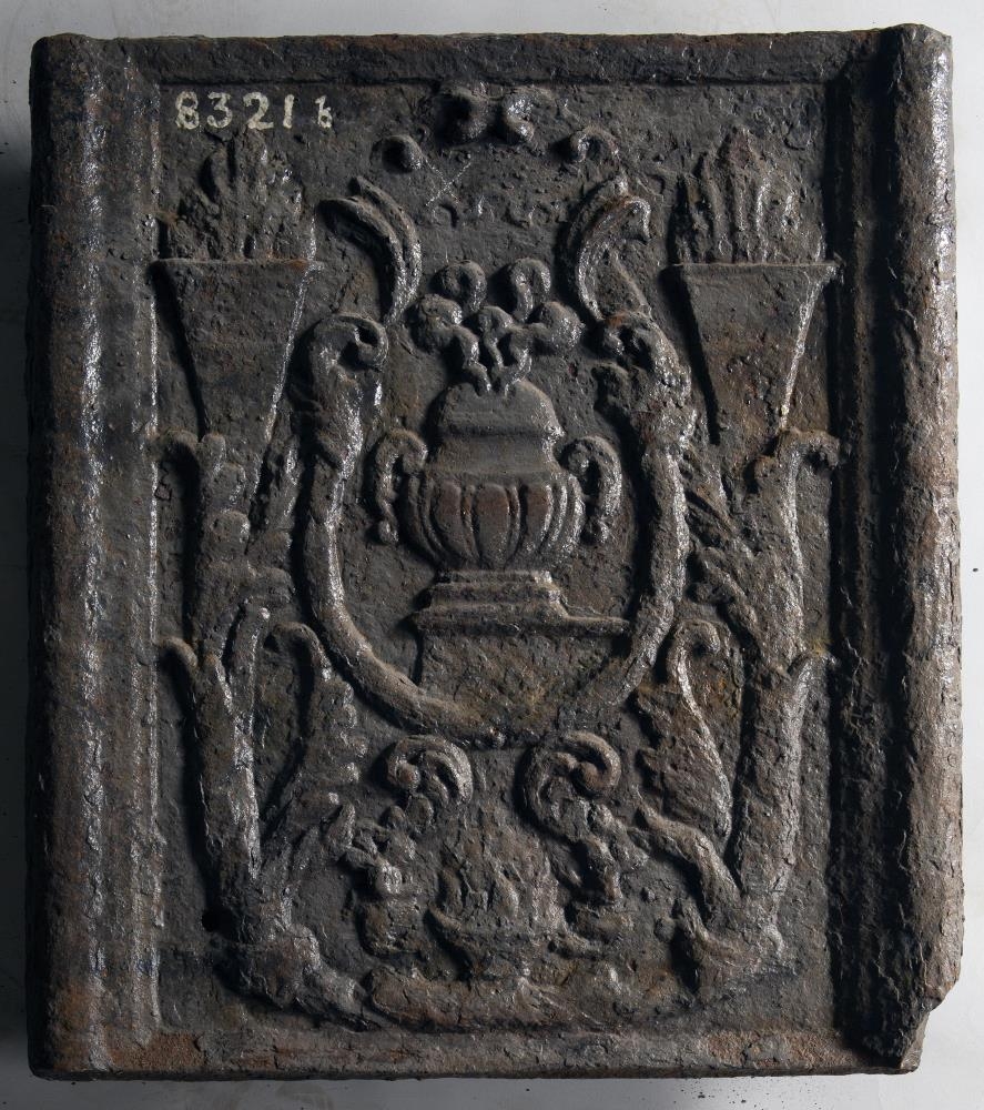 Ofnplötur 2, hliðarplötur af gömlum bíleggjara báðar eins, nema það brotið af annari, sem gengið hefur inn í múrinn og er nær 8 cm. breitt á hinni, hægri plötunni, a.: auk þess er hún að br. 61 cm. og að h. 75. Á þessum plötum er upphleypt blómskraut og blys: í miðju stalla-horn og ker á því.