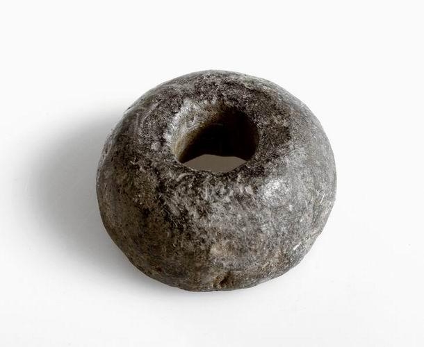 Snældusnúður úr klébergi. Fundinn við rannsóknir á Stöng í Þjórsárdal, sem eyddist í Heklugosi um árið 1104. 13847 Snældusnúður úr klébergi. Fundinn við rannsóknir á Stöng í Þjórsárdal á Suðurlandi, sem eyddist í Heklugosi um árið 1104. 13847 Spjaldtexti: Tóvinna Víða finnast merki um tóvinnu í Þjórsárdal. Steinsnúðar af halasnældum, kljásteinar og vefjarskeið fundust í stofunni á Stöng. Textiles Traces of textile work have been found in various places in the Þjórsá valley: in the living-room at Stöng, stone spindle-whorls, loom-weights and a sword-beater were unearthed.