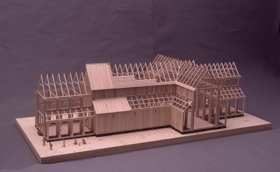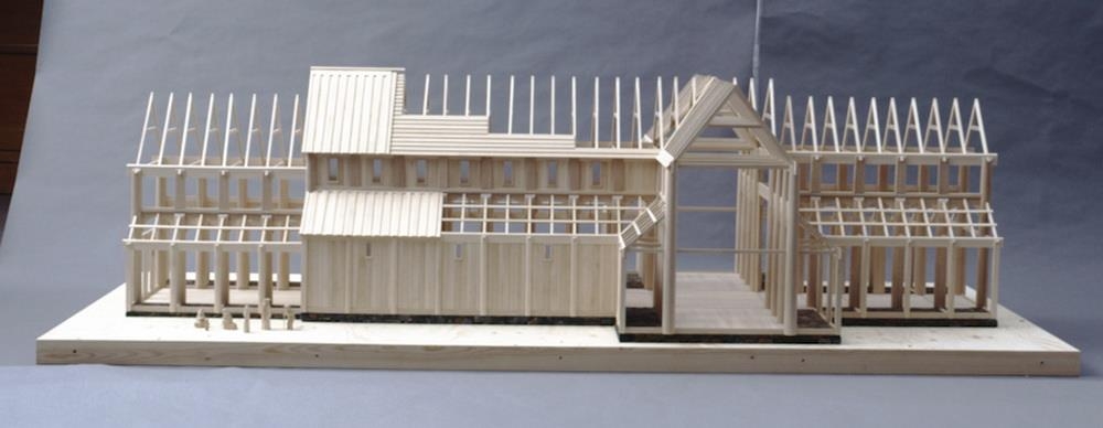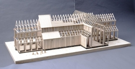 Reconstruction of a medieval Icelandic cathedral of stave construction. It is characterised by vertical panels slotted into a frame of vertical posts and horizontal beams.