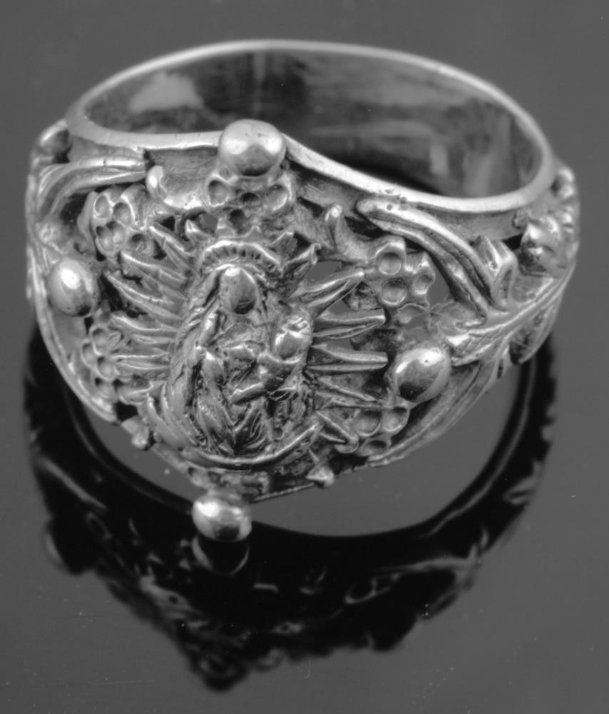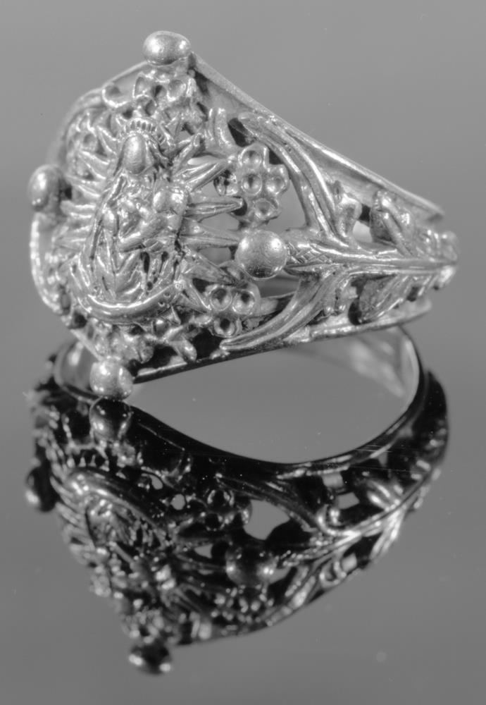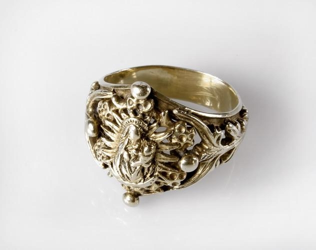 Gullhringur, smíðaður á 15. eða 16. öld, með upphleyptu verki í gotneskum stíl. Sagður úr eigu Brynjólfs biskups Sveinssonar.