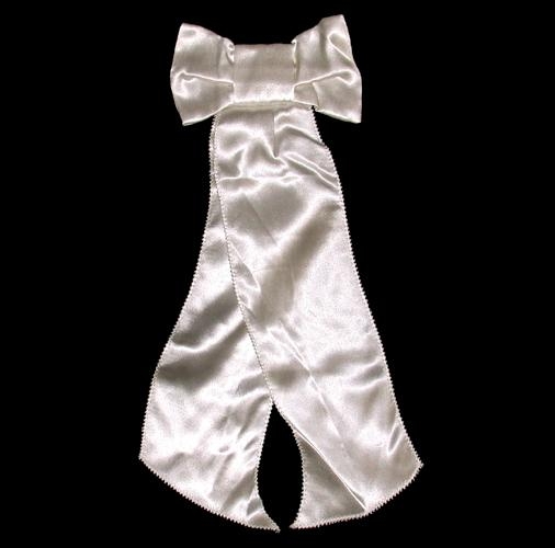 hvítu satínefni og að mestu vélsaumaður en slaufan fest saman og við borðana