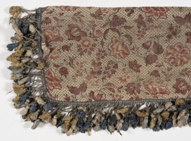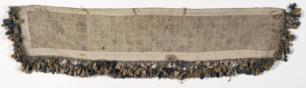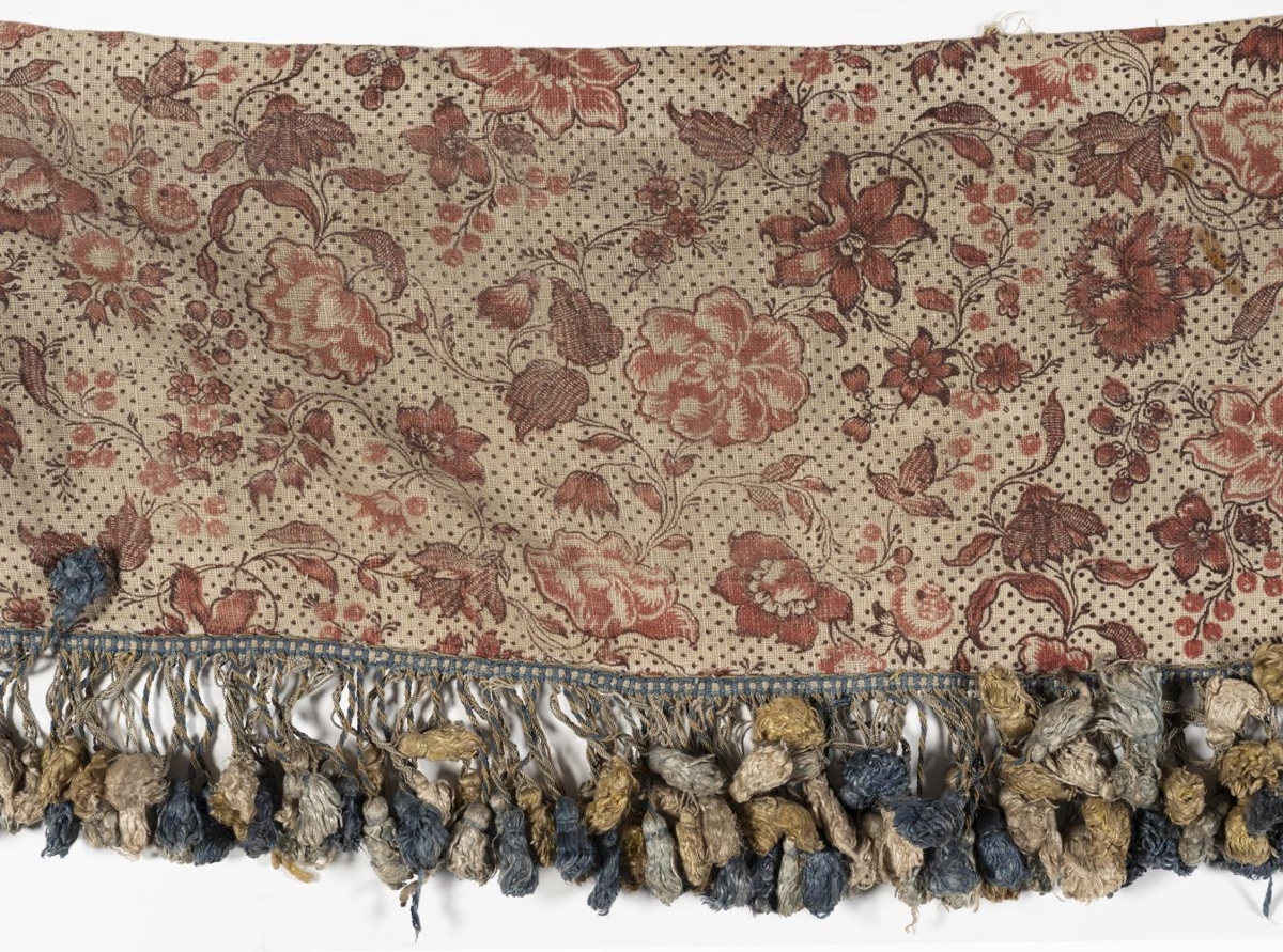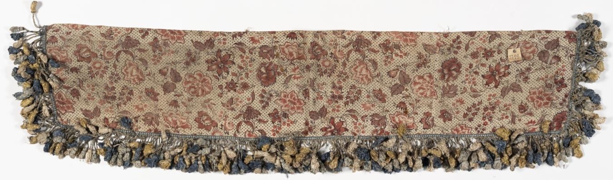 Þessi refill eða brún er úr sama efni og búðartjaldið nr. 3298, þ.e. grófu hörlérefti með áþrykktum, rauðlitum blómum, laufum, rósum og doppum.