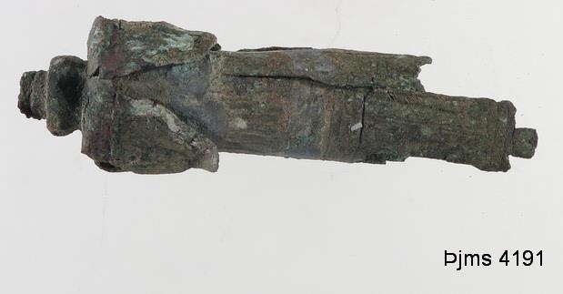 Leifar af hólk eða búning úr látúni af eptri enda á hnífskapti: hólkurinn er töluvert grafinn og aptan í hann er fest húfa með typpi aptur úr og 4 laufum gröfnum, er ganga fram á hólkinn: þetta alt er orðið mjög fornfálegt og eytt af grænu.