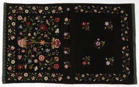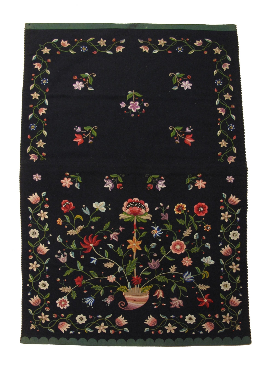 Svart söðuláklæði fóðrað með brúnu ullarfóðri. Efst og neðst er græn líning, og meðfram langhliðum eru marglitar snúrur. Í svartan flötinn eru saumuð marglit blóm (blómstursaumur).