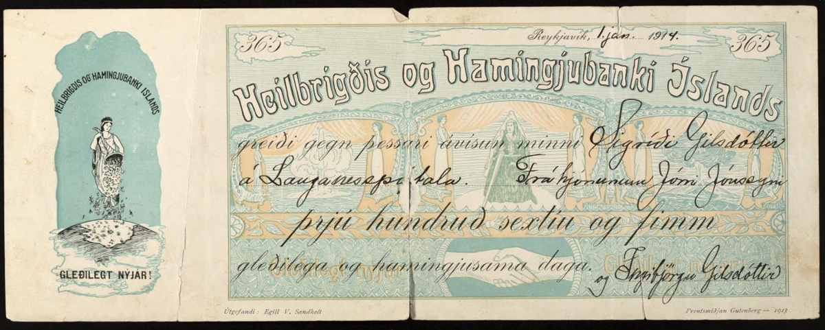 "Ávísun" til "Heilbrigðis og Hamingjubanka Íslands," Eitt eintak. Þetta hvítur pappírsmiði með útliti ávísunar. Með prentuðum áletrunum, skrauti og myndum, í svörtum lit, grænum og bleikum, og fyllt út með bleki. Ávísunin er handa Sigríði Gilsdóttur, Laugarnesspítala, og frá hjónunum Jóni Jónssyni og Ingibjörgu Gilsdóttur, sem óska henni 365 gleðilegra og hamingjusamra daga. Á er ritað hinn 1. janúar 1904. Útgefandi er Egill V. Sandholt. Prentað í Gutenbergsprentsmiðju árið 1913. Dálítið er miðinn farinn að rifna.